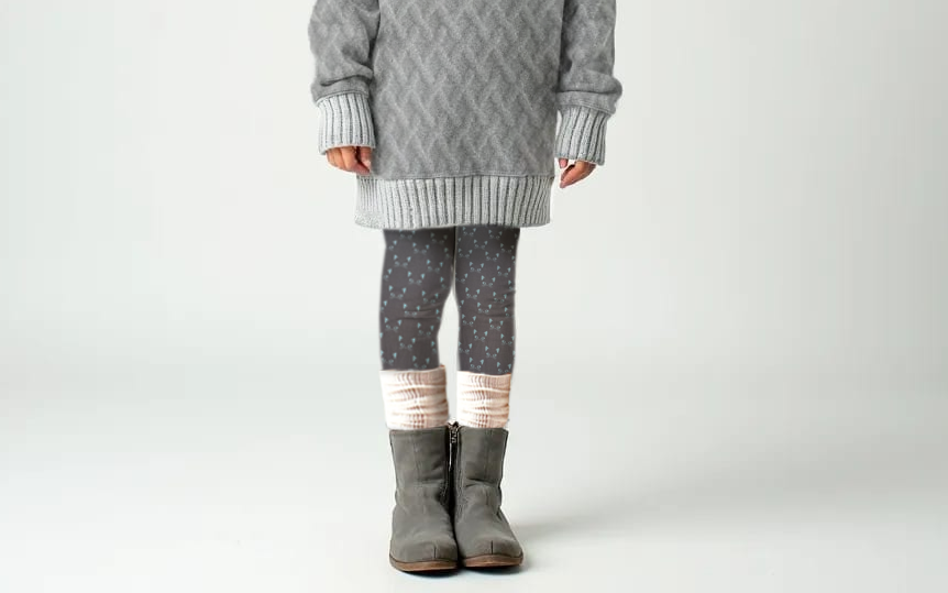 Leggings de algodón orgánico incluyen un estampado encantador de gaticos infantiles en color azul claro sobre un fondo cafe claro. Para inspirarte, te mostramos cómo lucen puestos: combínalos con un hermsoso sweater, botas y medias que sobresalgan por encima de las botas para un estilo moderno y divertido. (Nota: El sweater, botas y medias mostradas en la imagen no están incluidos).